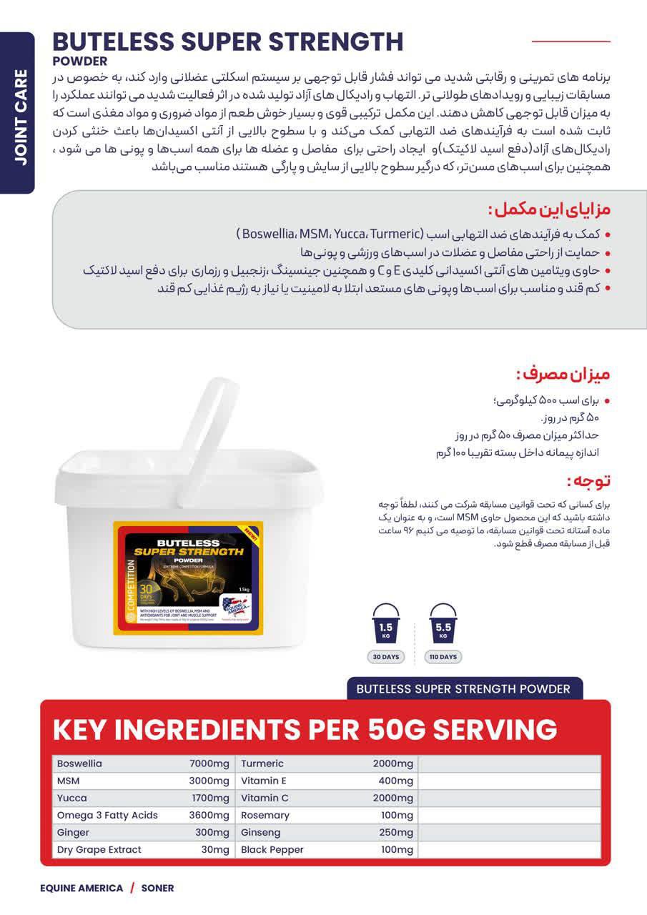 برنامه های تمرینی و رقابتی شدید میتواند فشار قابل توجهی بر سیستم اسکلتی عضلانی وارد کند به خصوص در مسابقات زیبایی و رویدادهای طولانی تر. التهاب و رادیکالهای آزاد تولید شده در اثر فعالیت شدید می توانند عملکرد را به میزان قابل توجهی کاهش دهند. این مکمل ترکیبی قوی و بسیار خوش طعم از مواد ضروری و مواد مغذی است که ثابت شده است به فرآیندهای ضد التهابی کمک میکند و با سطوح بالایی از آنتی اکسیدانها باعث خنثی کردن رادیکالهای آزاد (دفع) اسید لاکیتک و ایجاد راحتی برای مفاصل و عضله ها برای همه اسبها و پونی ها می شود ، همچنین برای اسبهای مسن تر که درگیر سطوح بالایی از سایش و پارگی هستند مناسب میباشد