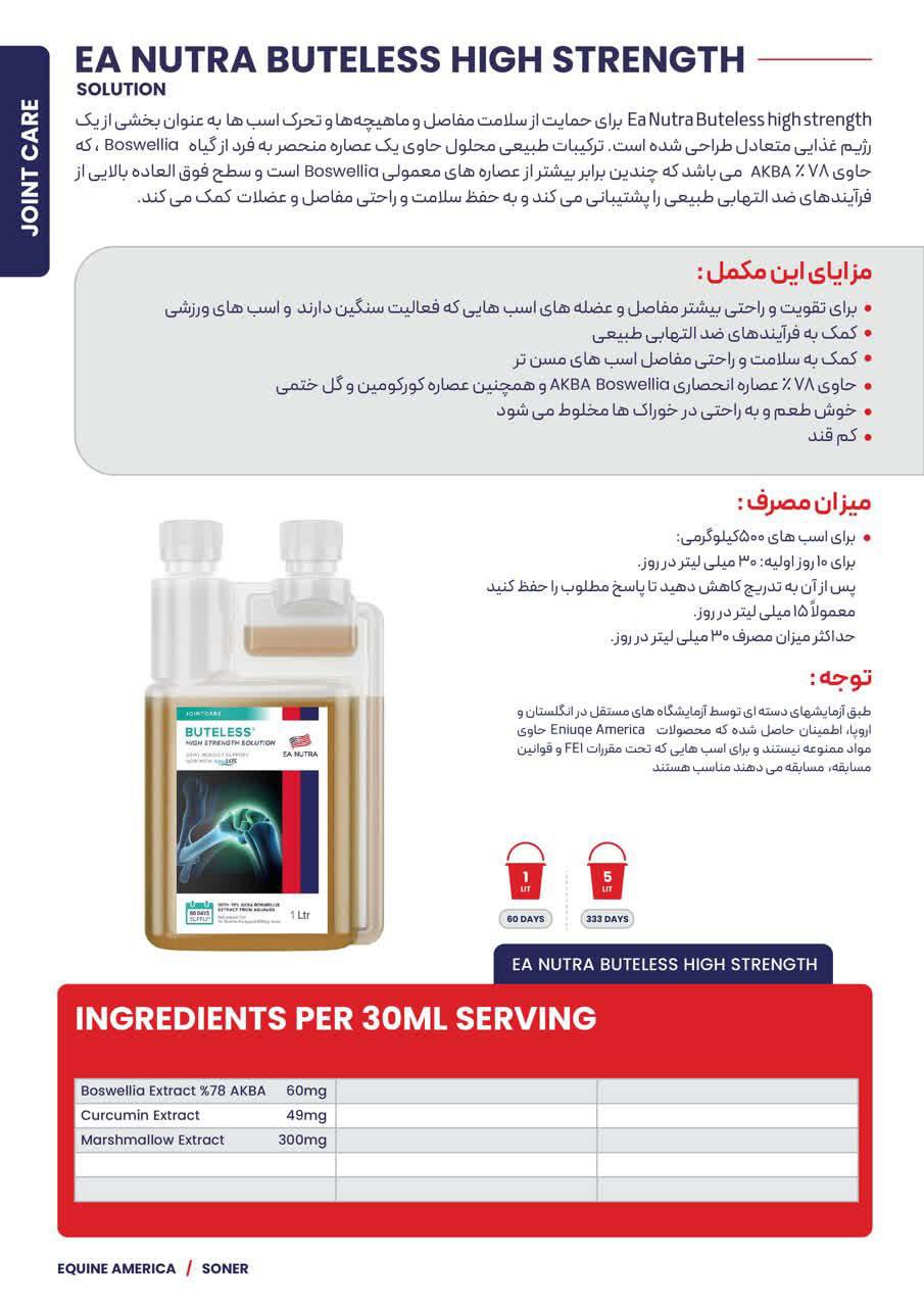 EaNutra Buteless high strength برای حمایت از سلامت مفاصل و ماهیچه ها و تحرک اسبها به عنوان بخشی از یک رژیم غذایی متعادل طراحی شده است. ترکیبات طبیعی محلول حاوی یک عصاره منحصر به فرد از گیاه Boswellia ، که حاوی ۷۸ AKBA میباشد که چندین برابر بیشتر از عصارههای معمولی Boswellia است و سطح فوق العاده بالایی از فرآیندهای ضد التهابی طبیعی را پشتیبانی میکند و به حفظ سلامت و راحتی مفاصل و عضلات کمک میکند